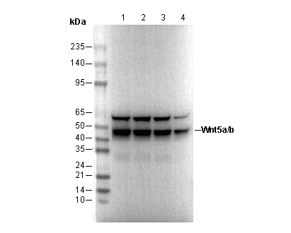 Wnt5a/b Antibody [K19B14] detects endogenous levels of Wnt5a and Wnt5b proteins. This antibody cross-reacts with an unidentified protein between 55 and 60 kDa.