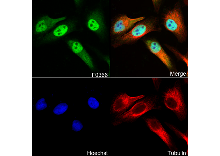 • Immunofluorescent analysis of Hela cells using F0366 (green, 1:50), Hoechst (blue) and tubulin (Red).