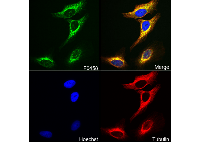 • Immunofluorescent analysis of Hela cells using F0458 (green, 1:200), Hoechst (blue) and tubulin (Red).