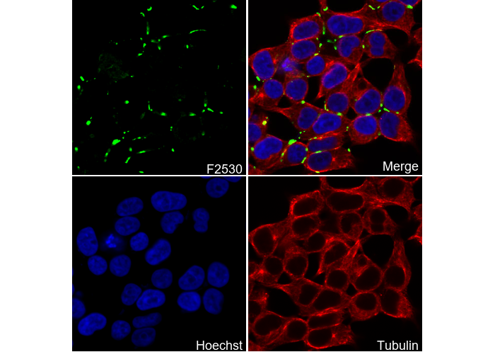• Immunofluorescent analysis of 293T cells using F2530 (green, 1:100), Hoechst (blue) and tubulin (Red).