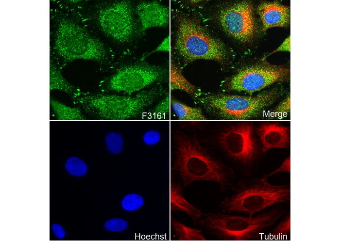 • Immunofluorescent analysis of Hela cells using F3161 (green, 1:500), Hoechst (blue) and tubulin (Red).