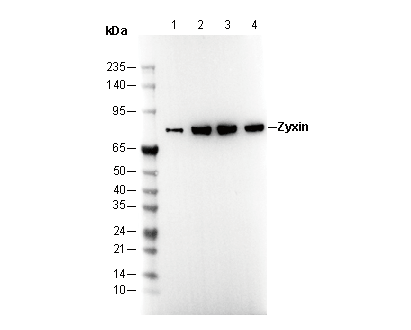 Zyxin Antibody [A12B20] recognizes endogenous levels of total Zyxin protein.