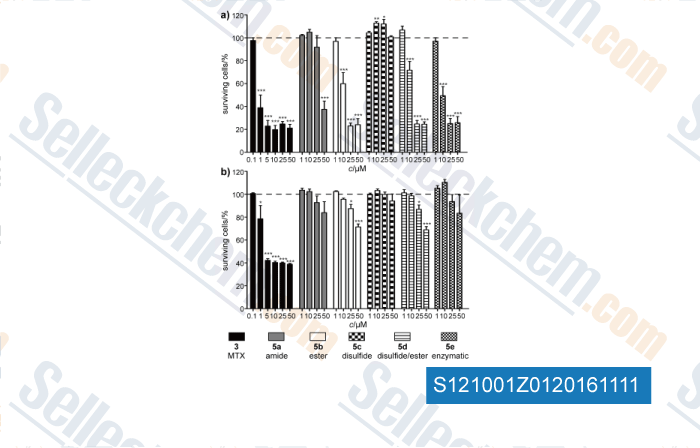 | in vitro | Methotrexate (0.1-10 mM) induces apoptosis of in vitro activated T cells from human peripheral blood. This compound achieves clonal deletion of activated T cells in mixed lymphocyte reactions. It can selectively delete activated peripheral blood T cells by a CD95-independent pathway. [1] This chemical is taken up by cells via the reduced folate carrier and then is converted within the cells to polyglutamates. It leads to diminished production of leukotriene B4 by neutrophils stimulated ex vivo. Its polyglutamates inhibit the enzyme aminoimidazolecarboxamidoadenosineribonucleotide (AICAR) transformylase more potently than the other enzymes involved in purine biosynthesis. This compound is also known to suppress TNF activity by suppressing TNF-induced nuclear factor-κB activation in vitro, in part related to a reduction in the degradation and inactivation of an inhibitor of this factor, IκBα, and probably related to the release of adenosine. It suppresses the production of both TNF and IFN-γ by T-cell-receptor-primed T lymphocytes from both healthy human donors and RA patients. This treatment is associated with a significant decrease of TNF-α-positive CD4+ T cells, while the number of T cells expressing the anti-inflammatory cytokine IL-10 increased. [2] |