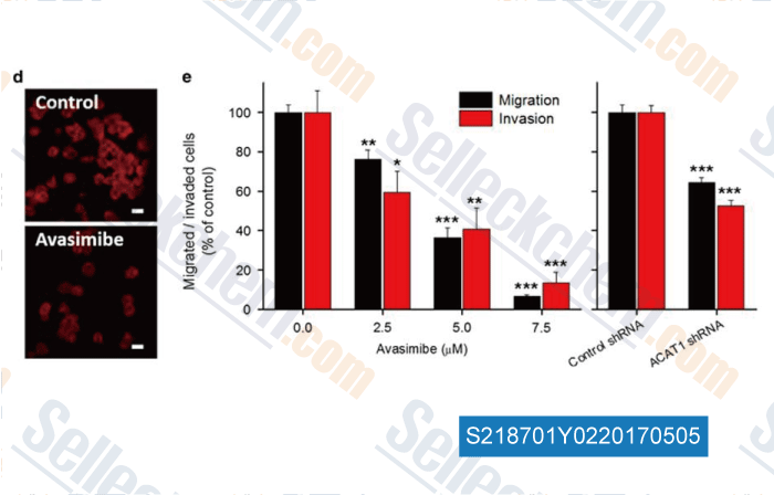 | in vitro | Avasimibe at concentration of 1μg/mL causes reduction of Total cholesterol (TC) and Esterified cholesterol (EC) through inhibiting LDL binding and decreasing scavenger receptor numbers during foam cell formation in human monocyte-derived macrophages (HMMs). This compound at concentration of 2μg/mL enhances cholesterol efflux from established HMM foam cells preincubating with 10μg/ml LDL. [1] It inhibits Lipoprotein(a) accumulation in the culture media of primary monkey hepatocyte in a dose-dependent manner with 11.9% -31.3% inhibition, the change is mainly associated with decreased ApoA. [2] This chemical incubating at concentration of 10 nM, 1 μM, and 10 μM for 24 hours in HepG2 cells reduce ApoB secretion into media by 25%, 27%, and 43%, respectively. It decreases ApoB secretion by enhanced intracellular degradation of ApoB rather than decreased synthesis of ApoB. [3] The compound inhibits ACTC with IC50 of 3.3 μM in IC-21 macrophages with consideration of the total inhibitor concentration in the assay sample. [4] It inhibits human P450 isoenzymes CYP2C9, CYP1A2 and CYP2C19 with IC50 of 2.9 μM, 13.9 μM and 26.5 μM, respectively. [5] This inhibitor inhibits ACAT-1 expression and cholesterol ester synthesis in glioma cell lines. It inhibits the growth of the glioma cells by inducing cell cycle arrest and apoptosis due to caspase-8 and caspase-3 activation. [6] |