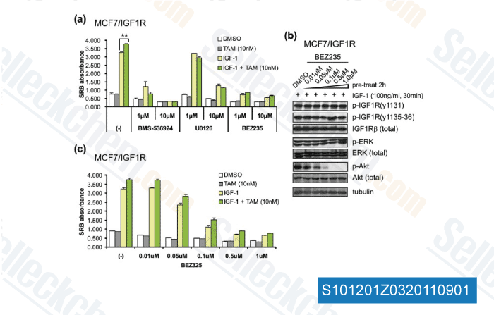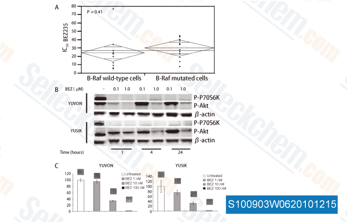 | 実験の流れ | The human CRC cell lines, HCT116 (PIK3CA mutant; kinase domain at H1047R), DLD-1 (PIK3CA mutant; helical domain at E545K), and SW480 (PIK3CA wild-type) and isogenic DLD-1 PIK3CA mutant as well as wild-type cells are maintained in DMEM with 10% FBS and 1 × Penicillin/Streptomycin. Cells are plated at different initial densities (HCT116: 3 × 103 cells/well, DLD-1: 5.5 × 103 cells/well, SW480: 4.5 × 103 cells/well, DLD-1 PIK3CA mutant: 7 × 103 cells/well, and DLD-1 PIK3CA wild-type: 9 × 103 cells/well) to account for differential growth kinetics. After 16 hours, cells are incubated with increasing concentrations of Dactolisib (BEZ235), and the drug-containing growth medium is changed every 24 hours. Cell viability is assessed 16 hours after the initial plating and 48 hours after initiation of treatment with this compound using the colorimetric MTS assay CellTiter 96® AQueous One Solution Cell Proliferation Assay, as per the manufacturer's instructions. Cell viability after drug treatment is normalized to that of untreated cells also grown for 48 hours. For western blot analysis, cells are plated with zero or maximum inhibitory dose (500 nM) of it for 2, 6, 24, or 48 hours. |