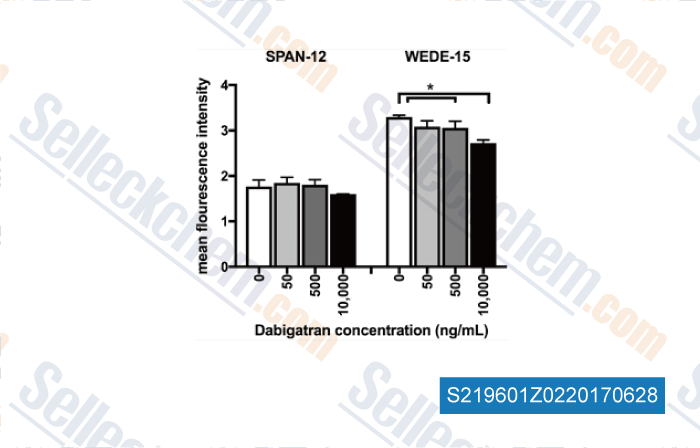 | in vivo | BIBR 953 exhibits the most favorable activity profile following i.v. administration to rats. [1] The bioavailability of this compound after p.o. administration of dabigatran etexilate is 7.2%. It is predominantly excreted in the feces after p.o. treatment and in the urine after i.v. treatment. The mean terminal half-life of this chemical is approximately 8 hours. Its acylglucuronides accounts for 0.4% and 4% of the dose in urine after p.o. and i.v. dosing, respectively. [3] |