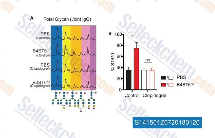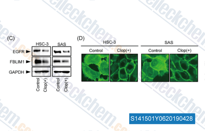 | in vitro | Clopidogrel is converted to its active metabolite by cytochrome P450 (CYP) enzymes. [1] Clopidogrel (1 μM) also inhibits EGF-stimulated EGF receptor, PERK expression, and cell proliferation in RGM-1 cells (P<0.05), and causes much less inhibition of EGF-stimulated cell proliferation in EGF receptor over-expressed RGM-1 cells than in RGM-1 cells (22% vs. 32% reduction). [2] Clopidogrel increases blood vessel number, reduces polymorphonuclear count and decreases attachment and bone loss, also decreases osteoclast number in rats submitted or not to periodontal repair. Clopidogrel decreases CXCL4, CXCL12 and PDGF content compared with saline-treated rats, without affecting CXCL5. [3] |