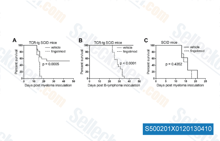 | in vitro | The inhibitory effect of S1P is revered by various concentrations of FTY720, with IC50 effect of 173 nM. In addition, FTY720 (10 nM) alone exerts no effect on the expression of co-stimulatory molecules. FTY720 reverses the increased expression of HLA-I induced by S1P for both the percentages of cells and the MFI, upon comparing the effect of S1P to the effect of combining S1P with FTY720. Medium and high-dose FTY720-P also enhances the levels of TGF-β1. TGF-β1 and Foxp3 mRNA expression are upregulated in the high-dose FTY720-P group. The proliferation of effector T cells is suppressed significantly in the medium and high-dose FTY720-P group at a Treg/Teff cell ratio of 1:1. At a ratio of 1:1, the proliferation of effector T cells is also suppressed in the high-dose FTY720 group. |