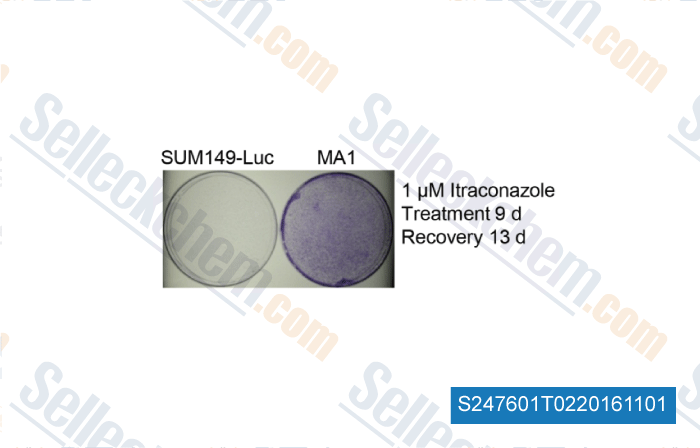 | in vitro | Itraconazole is metabolized into hydroxy-itraconazole (OH-ITZ), a known in vivo metabolite of ITZ, and two new metabolites: keto-itraconazole (keto-ITZ) and N-desalkyl-itraconazole (ND-ITZ). This compound is a substrate for CYP3A in vitro and to characterize the metabolites generated. It exhibits an unbound Km of 3.9 nM for CYP3A. Its metabolites are as potent as or more potent CYP3A4 inhibitors than ITZ itself. [1] This compound appears to act on the essential Hh pathway component Smoothened (SMO) by a mechanism distinct from that of cyclopamine and other known SMO antagonists, and prevents the ciliary accumulation of SMO normally caused by Hh stimulation. [2] It is active against 60 clinical isolates of Aspergillus spp. with geometric mean (GM) MICs of 0.25 mg/mL. [3] It acts primarily by impairing the synthesis of ergosterol, resulting in a defective fungal cell membrane with altered permeability and function. This chemical is effective for a wide variety of mycotic infections and some fungal meningeal infections. [4] It has an affinity for mammalian cytochrome P-450 enzymes as well as for fungal P-450-dependent enzyme, and thus has the potential for clinically important interactions (e.g., astemizole, terfenadine, rifampin, oral contraceptives, H2 receptor antagonists, warfarin, cyclosporine). [5] |