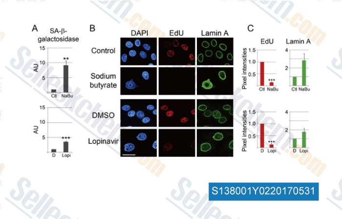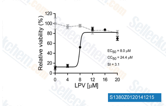 | in vitro | Lopinavir (ABT-378) binds to mutant HIV protease (V82A, V82F and V82T) with Ki of 4.9 pM, 3.7 pM and 3.6 pM, respectively. It inhibits 93% of wild-type HIV protease activity at 0.5 nM, and inhibits HIV protease activity in the absence and presence of 50% HS with EC50 of 17 nM and 102 nM, respectively, in MT4 cells. [1] This compound is converted to several metabolites in an NADPH-dependent manner in liver microsomes with the primary metabolites M-3 and M-4. [2] It is a potent inhibitor of Rh123 efflux in Caco-2 monolayers with IC50 of 1.7 mM. Exposure to it (72 hours) in LS 180V cells reduces the content of intracellular Rh123, and it induces P-glycoprotein immunoreactive protein and messenger RNA levels in LS 180V cells. [3] It inhibits subtype C clone C6 with IC50 of 9.4 nM. [4] It inhibits CYP3A with IC50 of 7.3 mM in human liver microsomes, while producing negligible or weak inhibition of human CYP1A2, 2B6, 2C9, 2C19 and 2D6. [5] |