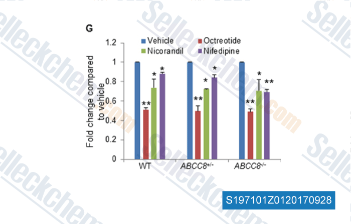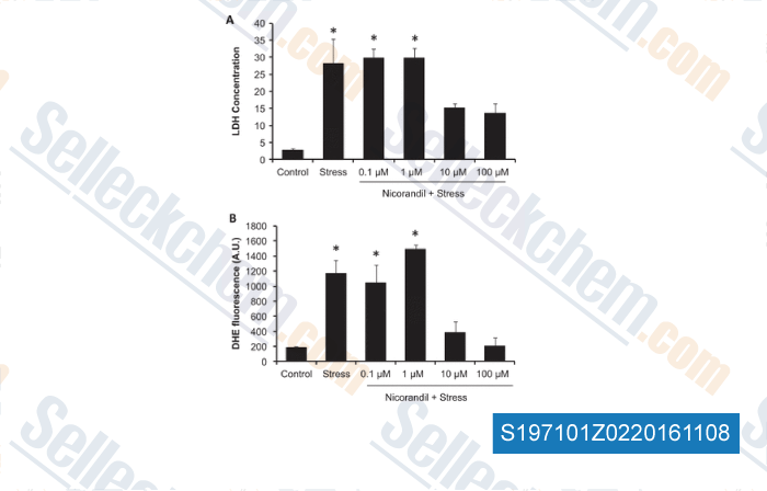 | in vitro | Nicorandil (100 mM) increases Flavoprotein oxidation but not membrane current; a 10-fold higher concentration recruits both mitoK(ATP) and surfaceK(ATP) channels. This compound bluntes the rate of cell death in a pelleting model of ischemia; this cardioprotective effect is prevented by the mitoK(ATP) channel blocker 5-hydroxydecanoate but is unaffected by the surfaceK(ATP) channel blocker HMR1098. [1] This chemical suppresses TUNEL positivity, cytochrome c translocation, caspase-3 activation and dissipation of mitochondrialinner membrane potential (Delta(Psi)(m)). It prevents Delta(Psi)(m) depolarization in a concentration-dependent manner (EC(50) approximately 40 mM, with saturation by 100 mM), as shown by fluorescence-activated cell sorter analysis of cells stained with a fluorescent Delta(Psi)(m)-indicator, tetramethylrhodamine ethyl ester (TMRE). [2] This compound activates a weakly inwardly-rectifying, glibenclamide-sensitive 80 pS K+ channel in both the transfected cells. It preferentially activates the K(ATP) channels containing SUR2B in HEK293T cells. [3] This chemical significantly suppresses the number of cells with TUNEL-positive nuclei and the increase in caspase-3 activity induced by 20 mM H2O2. It prevents the loss of DeltaPsim induced by H2O2 in a concentration-dependent manner. [4] |