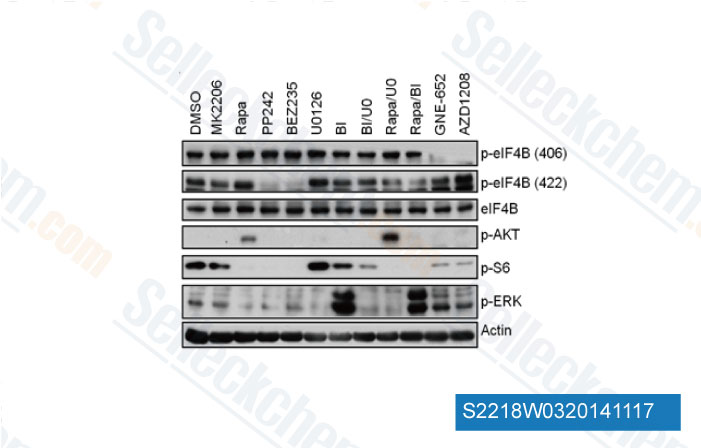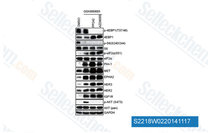 | in vitro | PP242 exhibits potent selectivity for mTOR over other PI3K family kinases such as p110α, p110β, p110γ, p110δ, and DNA-PK with IC50 of 1.96 μM, 2.2 μM, 1.27 μM, 0.102 μM, and 0.408 μM, respectively. This compound displays some inhibitory activity against Ret, PKCα, PKCβ, and JAK2, while exhibits remarkable selectivity against 215 other protein kinases. Unlike rapamycin, this inhibitor inhibits both mTORC1 and mTORC2. In BT549 cells, this chemical treatment (0.04-10 μM) inhibits the phosphorylation of Akt, the mTOR substrate p70S6K, and its downstream target S6 in a dose-dependent manner. It potently inhibits PKCα with IC50 of 49 nM. Low concentrations of this compound inhibit the phosphorylation of Akt S473 and higher concentrations partially inhibit Akt T308-P in addition to S473-P. As this agent is a more effective mTORC1 inhibitor than rapamycin, it inhibits the proliferation of primary MEFs, and the phosphorylation of 4EBP1 at T36/45 and S65, more potently than rapamycin. This compound but not rapamycin potently inhibits cap-dependent translation, by causing a higher level of binding between 4EBP1 and eIF4E than rapamycin. It potently inhibits the proliferation of p190-transformed murine BM, SUP-B15, and K562 cells with GI50 of 12 nM, 90 nM, and 85 nM, respectively. This inhibitor also inhibits the growth of solid tumor cell lines such as SKOV3, PC3, 786-O, and U87 with GI50 of 0.49 μM, 0.19 μM, 2.13 μM, and 1.57 μM, respectively. It is also more effective than rapamycin in achieving cytoreduction and apoptosis in multiple myeloma (MM) cells. |
