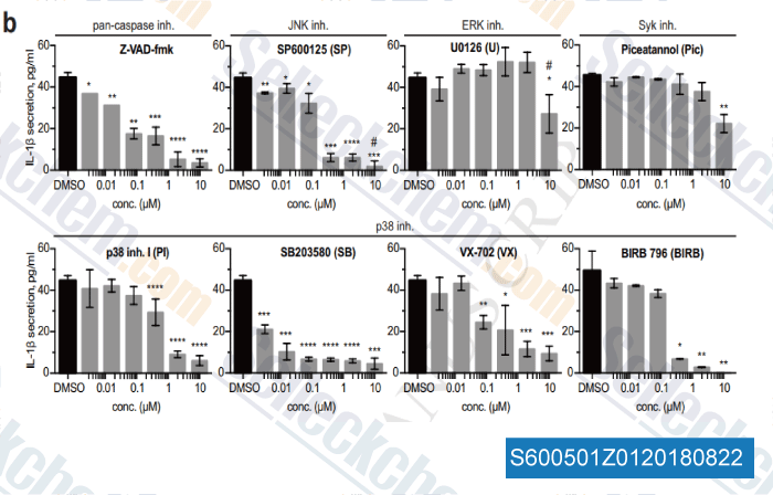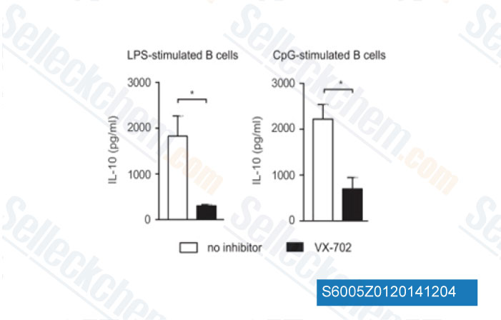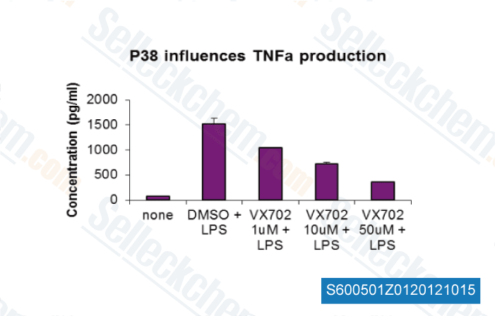 | in vitro | Pre-incubation of platelets with VX-702 (1 μM) completely or partially inhibits p38 activation (IC50 4 to 20 nM) induced by platelet agonists including thrombin, SFLLRN, AYPGKF, U46619 and collagen. This compound shows no effect on platelet aggregation induced by any of the p38 MAPK agonists in the presence or absence of anti-platelet therapies. [1] It inhibits the production of IL-6, IL-1β and TNFα (IC50 = 59, 122 and 99 ng/mL, respectively) in a dose-dependent manner. [2] |