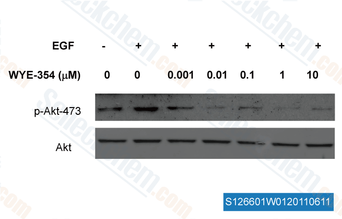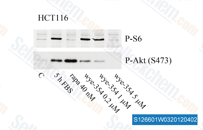 | in vitro | WYE-354 also inhibits several PI3Ks at micromolar levels. In HEK293 cells, this compound (0.2 μM–5 μM) effectively inhibits both mTORC1 and mTORC2. It (0.3 μM–10 μM) significantly blocks mTOR signaling and Akt activation in U87MG and MDA361 cells. Furthermore, this chemical potently inhibits proliferation in tumor cell lines including MDA-MB-361, MDA-MB-231, MDA-MB-468, LNCap, A498, and HCT116, with IC50 values ranging from 0.28 μM to 2.3 μM. The apoptosis induced by this compound is accompanied by G1 cell cycle arrest and caspases activation. In endothelial HUVEC cells, it (10 nM–1 μM) also inhibits both mTORC1 and mTORC2 signaling, as revealed by dephosphorylation of S6 ribosomal protein and Akt, respectively. Furthermore, this chemical (10 nM–1 μM) activates mitogen-activated protein kinase (MAPK) signaling, which may be due to its inhibition of mTORC1. |
