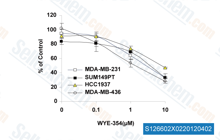 | 実験の流れ | Cells are plated in 96-well plates at 1000 to 3000 cells per well for 24 hours, treated with DMSO or varying concentrations of WYE-354. Viable cell densities are determined 72 hours later by MTS assay employing a CellTiter 96 kit. The effect of each treatment is calculated as percent of control growth relative to the DMSO-treated cells grown in the same culture plate. Inhibitor dose response curves are plotted for determination of IC50 values. | |