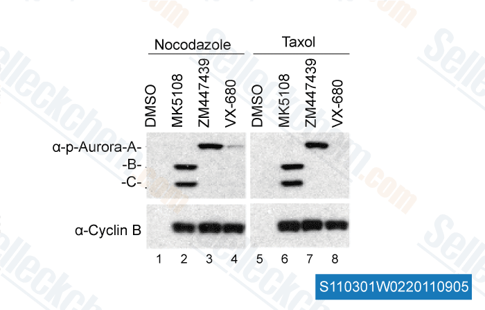 | in vitro | In vitro, ZM-447439 selectively inhibits recombinant human Aurora A and B with IC50 values of 110 and 130 nM, respectively, while other protein kinases of diverse structural types including the mitotic kinases CDK1 and PLK1 are inhibited with IC50 values >10 μM. [1] Aurora kinase inhibitor, ZM-447439 time- and dose-dependently inhibits the growth of all three cell lines with IC50 values of 3 μM (BON), 0.9 μM (QGP-1) and 3 μM (MIP-101) after 72 hours of continuous exposure. In addition, ZM-447439 potently induces cell apoptosis by promoting DNA fragmentation and caspase 3 and 7 activation, and arrests GEP-NET cells in the G0 /G1and G2/M phase of the cell cycle. [2] In mouse embryo, inhibition of Aurora kinase activity by ZM-447439 results in abnormalities during mitosis by regulating the phosphorylation of histone H3 serine 10 (H3S10Ph) from G2 to metaphase with different perturbations in each embryonic cycle. [3] A recent study shows that ZM-447439 exhibits growth inhibitory and proapoptotic effect on cervical cancer SiHa cells, and enhances the chemosensitivity. [4] |