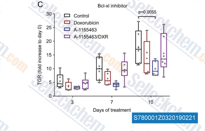 | in vivo | Following a single 5 mg/kg IP dose of A-1155463 in nontumor bearing SCID-Beige mice, platelet counts fall dramatically as measured at 6 h postdose and then rebound to normal levels within 72 h. Daily Dosing at 5 mg/kg IP to SCID-Beige mice that had been inoculated with BCL-XL-dependent H146 tumor cells for 14 days causes a statistically significant inhibition of tumor growth (maximum tumor growth inhibition = 44%), which is alleviated upon cessation of dosing[1]. |