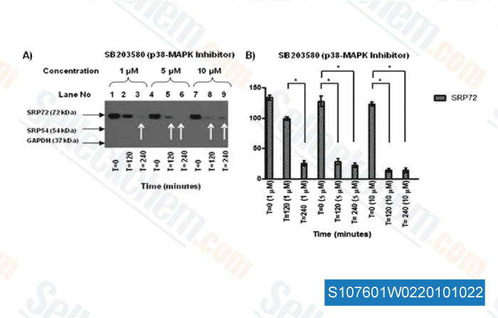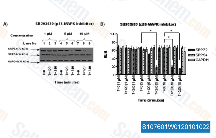 | in vivo | Adezmapimod (SB203580) protects pig myocardium against ischemic injury in an in vivo model. [4]It is effective to prevent and treat the disease in MRL/lpr mice model of Systemic lupus erythematosus (SLE). [5] |