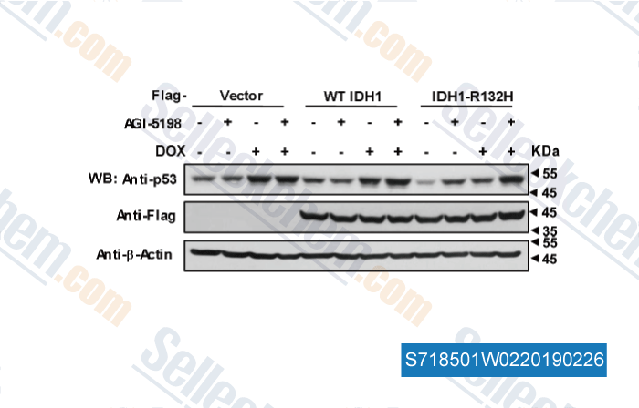 | in vitro | AGI-5198, potently inhibits mutant IDH1 (R132H-IDH1 and R132C-IDH1), but not wildtype IDH1 (IC50 > 100 μM) or any of IDH2 isoforms (R140Q, R172K, wildtype) (IC50 > 100 μM). This compound has been shown to have anti-tumor efficacy in the TS603 glioma cell line and to block R-2HG production in a dose-dependent manner. Under conditions of near-complete R-2HG inhibition, it induced demethylation of histone H3K9me3 and expression of genes associated with gliogenic differentiation. Blockade of mIDH1 impaired the growth of IDH1-mutant—but not IDH1–wild-type—glioma cells without appreciable changes in genome-wide DNA methylation. [1] |