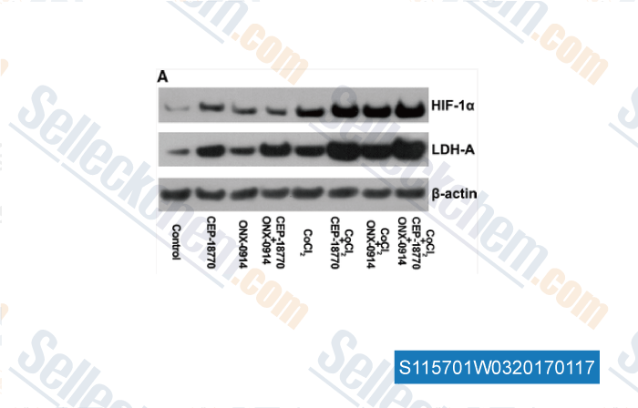| in vitro | CEP-18770 demonstrates marginal prevention of the tryptic and peptidyl gultamyl activities of the protesome.[1] CEP-18770 inhibits A2780 ovarian cancer cells, PC3 prostate cancer, H460, LoVo colon cancer, RPMI8226 multiple myeloma cancer and HS-Sultan anaplastic non-Hodgkin lymphoma with IC50 values of 13.7, 22.2, 34.2 11.3, 5.6 and 8.2 nM, respectively.[1] CEP-18770 blocks the ubiquitin-proteasome pathway in several MM and in the chronic myelogenous leukemia cell line, K562. CEP-18770 causes an accumulation of ubiquitinated proteins over 4 to 8 hours.[1] IκBα degradation is completely blocked by pretreatment with CEP-18770. CEP-18770 significantly inhibits high levels of NF-κB activity in both RPMI-8226 and U266 cells. The time- and concentration-dependent suppression of NF-kB DNA-binding activity in MM cell lines by CEP-18770 leads to a decrease of expression of several NF-κB-modulated genes mediating the growth and survival of tumor cells including IkBα itself, the X-chromosome-linked inhibitor-of-apoptosis protein (XIAP), the pro-inflammatory cytokines TNF-α and interleukin-1β (IL-1β), the intracellular adhesion molecule (ICAM1), and the pro-angiogeneic factor vascular endothelial growth factor. [1] The expression of these NF-κB–mediated genes are associated with more favorable clinical responsiveness to this agent, highlighting their potential prognostic value in response to CEP-18770 exposure. [1] The proapoptotic activity of CEP-18770 against MM is not limited solely to tumor-derived MM cell lines, but extends to primary MM explants from relapsed or refractory patients. [1] In addition, CEP-18770 in combination produces synergistic inhibition of MM cell viability in vitro.[2] |