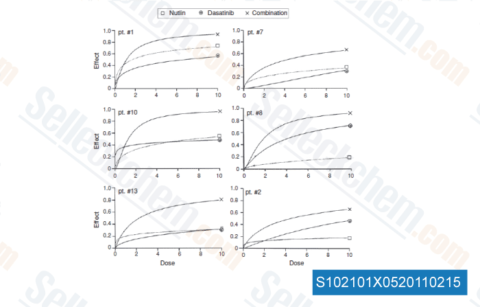 | in vitro | Dasatinib is more effective than imatinib in inhibiting the proliferation of Ba/F3 cells expressing wild-type Bcr-Abl and Bcr-Abl mutants, with the exception of T315I. Dasatinib has a two-log (∼325-fold) increased potency relative to imatinib. Dasatinib potently inhibits wild-type Abl kinase and all mutants except T315I over a narrow range. Dasatinib directly targets wild-type and mutant Abl kinase domains and inhibits autophosphorylation and substrate phosphorylation in a concentration-dependent manner. Dasatinib displays 325-fold greater potency compared with imatinib against cells expressing wild-type Bcr-Abl. [1] The percent of colonies of TgE bone marrow cells are decreased from 100% in untreated wells to 4.12% in Dasatinib treated wells. In the presence of Dasatinib, the difference in the percentage of colonies formed by WT and TgE bone marrow cells is statistically significant. Expression of LMP2A is able to promote B lymphocyte survival and proliferation, which can be inhibited by targeting Lyn and/or c-Abl kinases through Dasatinib. [3] Dasatinib treatment inhibits Src signaling, decreases growth, and induces cell cycle arrest and apoptosis in a subset of thyroid cancer cells. Treatment with increasing doses of Dasatinib (0.019 μM to 1.25 μM) for 3 days inhibits the growth of the C643, TPC1, BCPAP, and SW1736 cell lines by about 50% at low nanomolar concentrations, while higher concentrations are required to inhibit the growth of the K1 cell line. Treatment with 10 nM or 50 nM Dasatinib results in a 9-22% increase of cells in the G1 population among BCPAP and SW1736 and K1 cells, and a corresponding 7-18% decrease in the percentage of cells in the S phase. [4] |