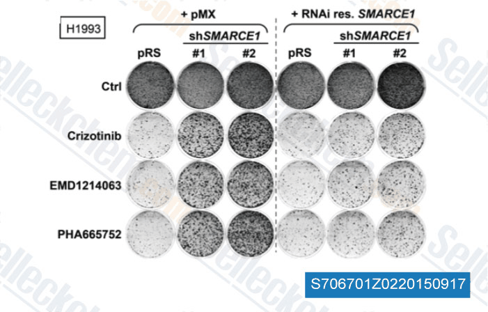 | in vitro | EMD 1214063 inhibits HGF-induced c-Met phosphorylation in A549 cells with IC50 of 6 nM. Treatment with this compound induces a marked reduction of c-Met–constitutive phosphorylation in EBC-1 cells with IC50 of 9 nM. It effectively blocka phosphorylation of the major downstream effectors of the c-Met enzyme, such as Grb2, Gab1, Sos, PLCγ, and phosphoinositide 3-kinase, in EBC-1, MKN-45, and Hs746T cells in the range of 1 to 10 nM. This chemical considerably inhibits the viability of MKN-45 cells with IC50 of less than 1 nM. Treatment with it (as low as 0.1 nM) inhibits HGF-induced NCI-H441 cell migration, whereas concentrations of 100 nM to 1 μM almost completely prevents it. [1] |