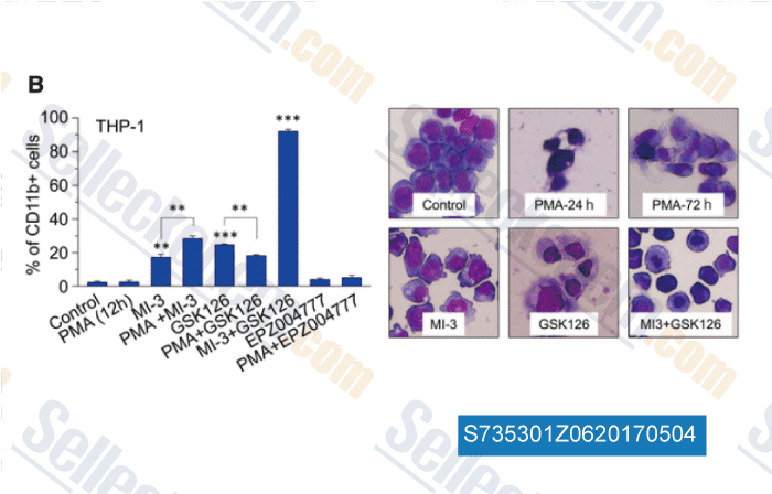 | in vitro | EPZ004777 selectively inhibits cellular H3K79 methylation and inhibits expression of key MLL fusion target genes. Following DOT1L inhibition, this compound selectively inhibits proliferation of MLL-Rearranged cell lines and MLL-AF9-transformed murine hematopoietic cells. In addition, it also induces differentiation and apoptosis in MLL-rearranged cells. This chemical selectively inhibits proliferation of MLL–AF10 and CALM–AF10-transformed murine bone marrow cells. DOT1L inhibition by this agent results in significantly decreased proliferation, decreased expression of MLL-AF6 target genes, and cell cycle arrest of MLL-AF6-transformed cells. |