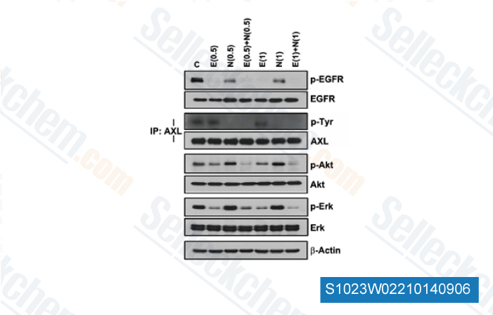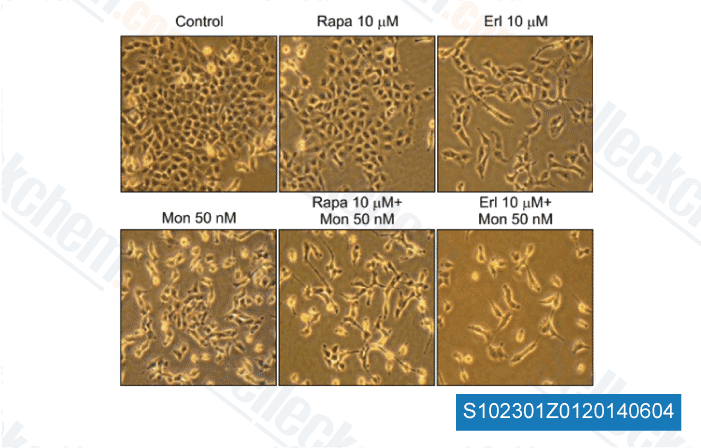 | in vitro | Erlotinib HCl potently inhibits EGFR activation in intact cells including HNS human head and neck tumor cells (IC50 20nM), DiFi human colon cancer cells and MDA MB-468 human breast cancer cells. This compound (1 μM) induces apoptosis in DiFi human colon cancer cells. [1] It inhibits growth of a panel of NSCLC cell lines including A549, H322, H3255, H358 H661, H1650, H1975, H1299, H596 with IC50 ranging from 29 nM to >20 μM. [2] This chemical (2 μM) significantly inhibits growth of AsPC-1 and BxPC-3 pancreatic cells. [3] The effects of this compound in combination with gemcitabine are considered additive in KRAS-mutated pancreatic cancer cells. Ten micromolar of this chemical inhibits EGFR phospho-rylation at the Y845 (Src-dependent phosphorylation) and Y1068 (auto-phosphorylation) sites. [4] Combination with this compound could down-modulate rapamycin-stimulated Akt activity and produces a synergistic effect on cell growth inhibition. [5] |