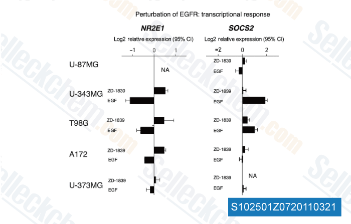 | in vitro | Gefitinib effectively inhibits all tyrosine phosphorylation sites on EGFR in both the high and low-EGFR-expressing cell lines including NR6, NR6M and NR6W cell lines. The phosphorylation sites Tyr1173 and Tyr992 are less sensitive requiring higher concentrations of this compound for inhibition. It effectively blocks the phosphorylation of PLC-γ, with IC50 of 27nM, in NR6W cells. The NR6wtEGFR and NR6M cell lines has low levels of PLC-γ phosphorylation but the level in the NR6M cell line is more resistant to inhibition by this chemical with IC50 of 43 nM and 369 nM, respectively. This compound inhibits Akt phosphorylations, with IC50 of 220 and 263nM, in the low-EGFR- and -EGFRvIII-expressing cell lines, respectively. It in the dose range from 0.1 to 0.5μM significantly facilitates, rather than abrogates, colony formation of NR6M cells. However, at a concentration of 2 μM this chemical completely blocks NR6M colony formation. It rapidly and in a dose-dependent manner inhibits EGFR and ERK phosphorylation up to 72 hours after EGF stimulation in both the high- and low-EGFR-expressing cell lines. [1] This compound is the monolayer growth of these EGF-driven untransformed MCF10A cells with an IC50 of 20 nM. [2] The combination of this chemical (0.2 μM and 0.5 μM) with irradiation lead to a significant growth inhibition in LoVo cells, compared with radiation alone.. [3] |
