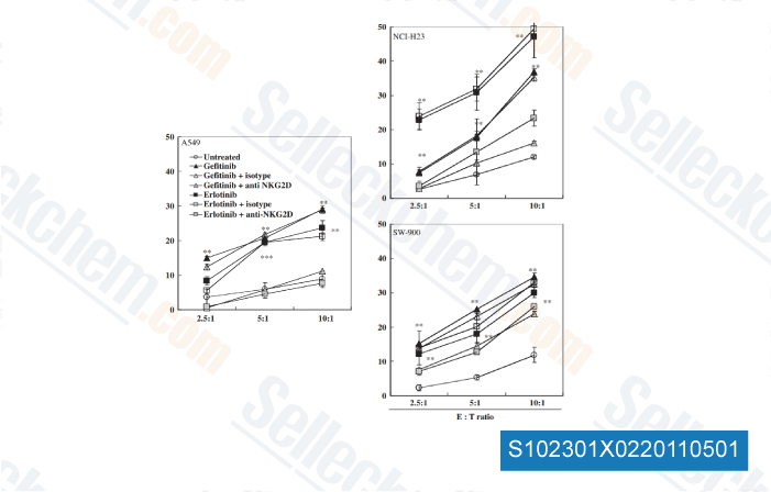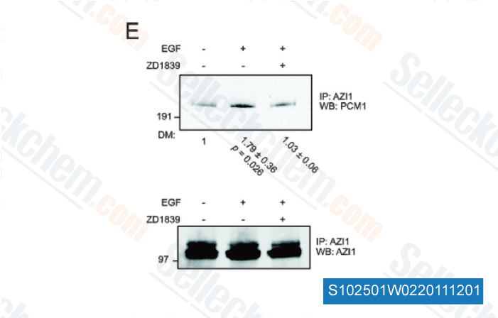 | 製品説明 | Gefitinib is an EGFR inhibitor for Tyr1173, Tyr992, Tyr1173 and Tyr992 in the NR6wtEGFR and NR6W cells with IC50 of 37 nM, 37nM, 26 nM and 57 nM, respectively. Gefitinib promotes autophagy and apoptosis of lung cancer cells via blockade of the PI3K/AKT/mTOR pathway. |