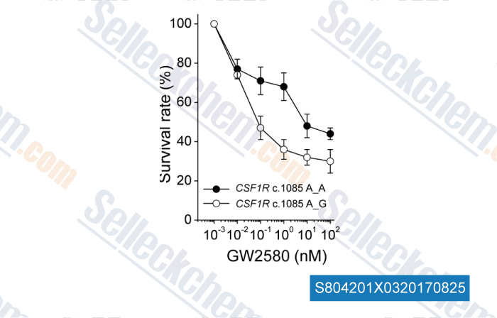 | in vitro | GW2580 completely inhibits human cFMS kinase in vitro at 0.06 μM. This compound inhibits the growth of CSF-1 stimulated M-NFS-60 myeloid tumor cells, serum stimulated NSO myeloid tumor cells, CSF-1 stimulated freshly isolated human monocytes, and VEGF stimulated human umbilical vein vascular endothelial cells with IC50 of 0.33, 13.5, 0.47 and 12 μM, respectively. 1 μM of this chemical completely inhibits CSF-1-induced growth of mouse M-NFS-60 myeloid cells and human monocytes and completely inhibits bone degradation in cultures of human osteoclasts, rat calvaria, and rat fetal long bone. [1] It inhibits CSF1R phosphorylation in RAW264.7 murine macrophages stimulated with 10 ng/mL with IC50 of approximately 10 nM. [2] This compound also inhibits TRKA activity with IC50 of 0.88 μM. [3] |
