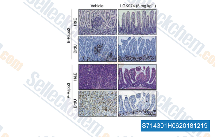 | in vitro | In the PORCN radioligand binding assay, LGK974 (WNT974) effectively displaces [3H]-GNF-1331 with an IC50 of 1 nM and shows no major cytotoxicity in cells up to 20 µM. It shows comparable inhibitory activities against all tested Wnts with IC50 ranging from 0.05 to 2.4 nM, which is consistent with the genetic loss of PORCN phenotype. [1] This compound specifically inhibits the growth of three RNF43-mutant cell lines, HPAF-II, PaTu 8988S, and Capan-2. [2] |