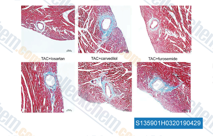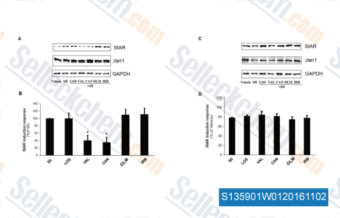 | in vivo | Losartan (180 mg/d) causes significant increases in plasma angiotensin II and angiotensin-(1-7) in monkeys with diet-induced hypercholesterolemia. Losartan (180 mg/d) reduces the extent of fatty streak in the aorta, the coronary arteries, and the carotid arteries by approximately 50% in monkeys with diet-induced hypercholesterolemia. Losartan reduces the susceptibility of LDL to in vitro oxidation, serum levels of monocyte chemoattractant protein-1, and circulating monocyte CD11b expression in monkeys with diet-induced hypercholesterolemia. [2] Losartan (0.6 g/L in their drinking water) prevents elastic fiber fragmentation and blunted TGF-β signaling in the aortic media in pregnant Fbn1C1039G/+ mice, as evidenced by reduced nuclear accumulation of pSmad2. Losartan (0.6 g/L in their drinking water) shows a reduction in distal airspace caliber in pregnant Fbn1C1039G/+ mice. Losartan (0.6 g/L in their drinking water) improves disease manifestations in the lungs, an event that cannot plausibly relate to improved hemodynamics in pregnant Fbn1C1039G/+ mice. [3] Losartan (5 mg/kg/d) leads to a significant decrease in the development of atherosclerotic lesions in the apo E deficient mice. Losartan (5 mg/kg/d) significantly reduces the susceptibility of the mice LDL to lipid oxidation following its incubation with CuSO4 in the apo E deficient mice. [4] Losartan (10 mg/kg) administration increases blood angiotensin levels four fold to six fold, blood BK levels are unchanged in male Sprague Dawley rats. Losartan (10 mg/kg) increases plasma renin levels 100-fold, plasma angiotensinogen levels decreases to 24% of control and plasma aldosterone levels are unchanged in male Sprague Dawley rats. [5] |