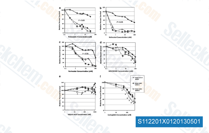 | in vitro | Mocetinostat (MGCD0103) inhibits only a subset of the nine human recombinant HDACs, including HDAC1, HDAC2, HDAC3, and HDAC11 at nanomolar or low micromolar concentrations, in a dose-dependent manner. It reveals most potent inhibitory activity against human HDAC1 and HDAC2 enzymes in vitro, and does not inhibit class II HDACs. The exocyclic amino group in this compound is necessary for enzyme inhibitory activity because HDAC-inhibitory activity against HDAC1 and HDAC2 is completely abolished with the desamino analogue. Its inhibitory activity reaches the maximum plateau at 6 μM, and the maximal inhibitable enzyme pool affected by MGCD0103 is 75% of the total enzyme activity in HCT116 cells whereas NVP-LAQ824 inhibits almost 100% of that in these cells. In A549 cells, it also exhibits dose-dependent inhibition of HDAC activity in whole cells. |