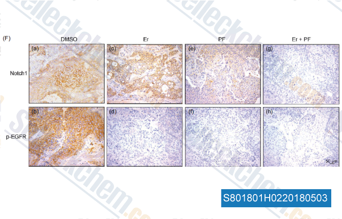 | in vivo | Nirogacestat (PF-03084014) orally administrated in a single dose of 200 mg/kg causes maximal NICD inhibition for ∼80% in xenograft HPB-ALL tumors. This compound shows robust antitumor activity in this mode with a maximal tumor growth inhibition of ∼ 92% at dose of 150 mg/kg, accompanied by a significant reduction of NICD/Notch1, tumor mitotic index (Ki67), and apoptosis (activated caspase-3) staining. [1] It also induces apoptosis, antiproliferation, reduces tumor cell self-renewal ability, impaires tumor vasculature, and decreases metastasis activity in breast cancer HCC1599 tumor-bearing mice at 120 mg/kg. The treatment displays significant antitumor activity in various types of the breast xenograft models with TGI value of at least 50%. [2] |
