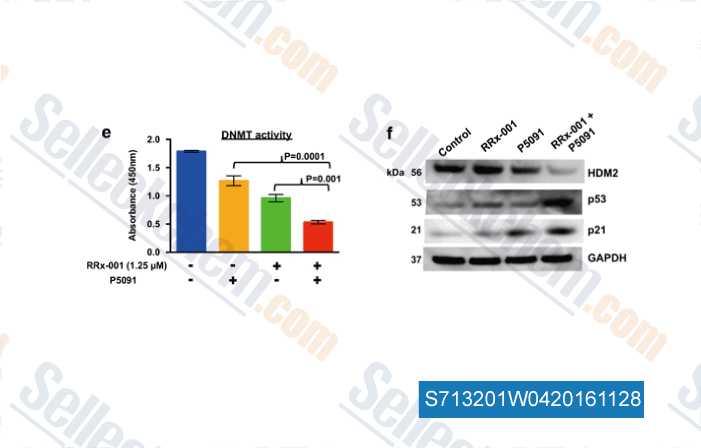 | in vitro | P5091 is a trisubstituted thiophene with dichlorophenylthio, nitro, and acetyl substituents mediating anti-USP7 activity. This compound exhibits potent, specific, and selective deubiquitylating activity against USP7. In contrast, it does not inhibit other DUBs or other families of cysteine proteases tested (EC50 > 100 mM). This chemical inhibits the labeling of USP7 with HA-UbVME in a concentration-dependent manner. USP7-mediated cleavage of high molecular weight polyubiquitin chains is inhibited in a dose-dependent manner by this compound. Moreover, it inhibits USP7- but not USP2- or USP8-mediated cleavage of poly K48-linked ubiquitin chains. USP7 inhibition by this compound induces HDM2 polyubiquitylation and accelerates degradation of HDM2. It inhibits USP7 deubiquitylating activity, without blocking proteasome activity in MM Cells. This chemical induces a dose-dependent decrease in viability of various MM cell lines. It overcomes bone marrow stromal cell-induced growth of MM Cells. This compound decreased HDM2 and HDMX, as well as upregulated p53 and p21 levels. Overall, this compound-induced cytotoxicity is mediated in part via HDM2-p21 signaling axis and although p53 is upregulated in response to this chemical treatment, the cytotoxic activity of it is not dependent on p53. [1] |