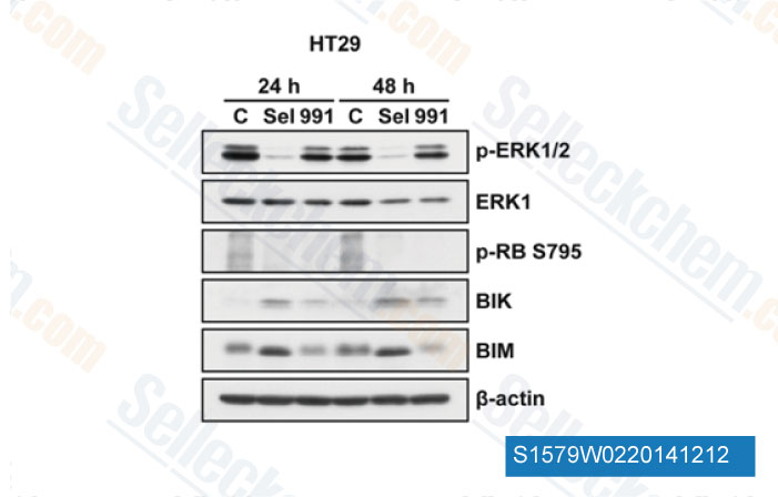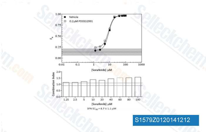 | in vitro | PD 0332991 exhibits absolute selectivity for CDK4/6 with little or no activity against other CDKs. PD 0332991 is effective at reducing Rb phosphorylation at Ser780 and Ser795 in MDA-MB-435 breast carcinoma cells with IC50 of 66 nM and 63 nM, respectively. PD 0332991 is a potent inhibitor of cell growth and suppresses DNA replication by preventing cells from entering S phase. PD 0332991 inhibits thymidine incorporation into the DNA of Rb-positive human breast (such as MDA-MB-435, MCF-7), colon (H1299), and lung carcinomas (Colo-205) as well as human leukemias (CRRF-CEM and K562), with IC50 values ranging from 0.04-0.17 μM. PD 0332991 significant increases the percentage of MDA-MB-453 in G1 period. [1] PD 0332991 inhibits phosphorylation of Rb in cycling CD138+ primary bone marrow myeloma cells, nontransformed primary B cells, MM1.S and CAG HMCLs cells line with IC50 of <0.1 μM, 0.05 μM, and 60-70 nM, respectively. PD 0332991 treatment also induces G1 arrest of CD138+ primary bone marrow myeloma and nontransformed primary B cells. PD 0332991 induces G1 arrest in MM1.S with IC50 of ~0.05 μM. [2] PD 0332991 preferentially inhibits proliferation of luminal estrogen receptor-positive (including HER2-positive) human breast cancer cell lines. PD 0332991 increases gene expression of pRb and cyclin D1 and decreases gene expression of CDKN2A (p16) in most sensitive lines. PD 0332991 enhances sensitivity to tamoxifen in cell lines with conditioned resistance to ER blockade. [3] |