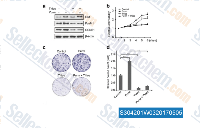 | in vitro | Purmorphamine activates the Hedgehog pathway by directly binds and activates Smoothened with IC50 of ~ 1.5 μM in compete with cyclopamine, a Smo antagonist. This compound is a potent inducer of osteogenesis in multipotent C3H10T1/2 cells. The EC50 (based on ALP expression) for this chemical is 1 μM in C3H10T1/2 cells. It (1 μM) and BMP-4 (100 ng/mL) together increase ALP activity more than 90-fold in 3T3-L1 cells. In contrast to BMP-4, this compound induces osteogenesis by activating Hedgehog signaling in multipotent mesenchymal progenitor cells. |