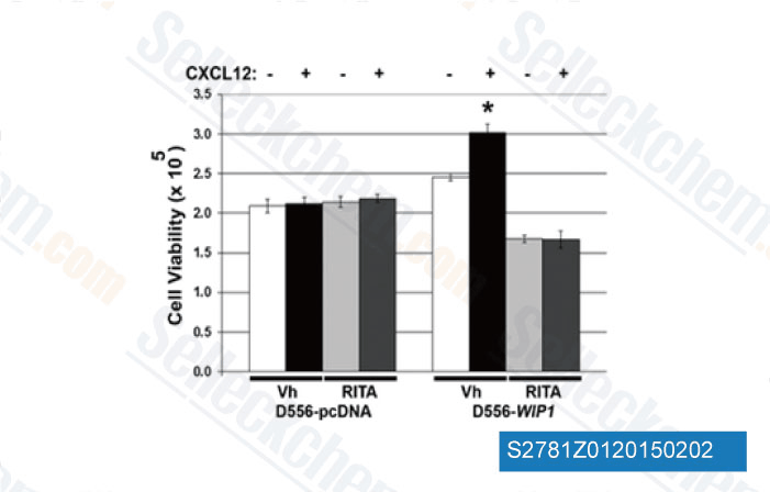 | in vitro | RITA shows a highly selective pattern of differential cytotoxic activity in the tumor cell lines, due to cellular accumulation to the cytosolic (S100) fraction. This compound also inhibits the growth of other renal cell lines including ACHN and UO-31 with IC50 of 13 μM and 37 μM, respectively. [1] It (10 nM) causes cell cycle arrest with accumulation of cells at the G2-M phase and induces DNA fragmentation and apoptosis at 100 nM, both with evaluated p53 protein levels. This chemical (30 nM) also induces both DNA-protein and DNA-DNA cross-links in A498 cells. Meanwhile it has no effects on top1-mediated relaxation of supercoiled SV40 DNA. [2] It significantly suppresses the growth of HCT116 cells (97%) but only slightly inhibits the growth of HCT116 TP53-/- cells (13%). This compound is much more efficient at growth suppression in wild-type p53-expressing tumor cell lines than in cell lines lacking p53 and those expressing mutant p53. It binds full-length p53 but not glutathione S-transferase (GST) protein or HDM-2 (a key regulator of p53 is strongly supported by the rescue of embryonic lethality of MDM2). This chemical blocks p53−HDM-2 interaction and p53 ubiquitination. It substantially decreases the amount of HDM-2 that is co-precipitated with p53, although both proteins are upregulated. This compound prevents interactions between the purified GST-p53 and 6XHis-tagged His-HDM-2 proteins. [3] It is shown to induce apoptosis by promoting p53Ser46 phosphorylation. [4] This chemical induces activation of p53 in conjunction with up-regulation of phosphorylated ASK-1, MKK-4 and c-Jun. It induces the activation of JNK signaling. [5] But On the contrary, another results by nuclear magnetic resonance (NMR) show that it does not block the formation of the complex between p53 (residues 1-312) and the N-terminal p53-binding domain of MDM2 (residues 1-118), which is highly probable that the binding of this compound requires native conformation of p53. [6] |