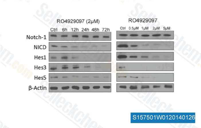 | in vitro | RO4929097 decreases the amount of Aβ peptides secreted into the culture medium in HEK293 cells with EC50 of 14 nM. This compound strongly inhibits Notch processing with EC50 of 5 nM in the Notch cell-based reporter assay. The potency of this chemical in cell-free and cellular assays is in the low nanomolar range with >100-fold selectivity observed with respect to 75 other proteins of various types including receptors, ion channels, and enzymes (CEREP panel). After 5 days of treatment, it reduces the production of ICN in the human NSCLC A549 cells inducing a flattened and less transformed tumor cell phenotype in tissue culture. [1] It blocks Notch processing in human non-small cell lung carcinoma cells and decreases expression of the Notch transcriptional target gene Hes1. Treatment with this compound reveals a two- to threefold decrease in the expression of direct Notch target genes, Hes1, Hey1, and Heyl in SUM149 and a 3.5- to eightfold decrease in expression in SUM190 cells. It modestly inhibits the growth of SUM149 cells in a dose-dependent manner. At a concentration of 1 μM of this chemical, growth inhibition is 20 % for SUM149 and 10 % for SUM190 cells, relative to vehicle-treated controls. It decreases the production of inflammatory cytokines by T-cells. Furthermore, with this treatment, there is a shift in favor of TH2 over TH1 cytokines. In addition, T-cell activation induced IL-6 production would be increased with this compound. [2] Upon this treatment, the selected melanoma cell lines reveals downregulation of NOTCH downstream effector HES1. A decrease in the amount of melanospheres formed upon this treatment in primary melanoma cell lines is detected. [3] |