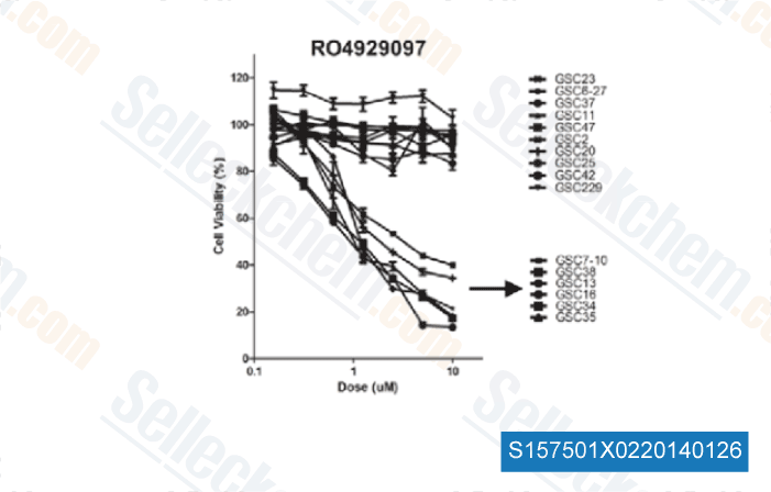 | in vivo | Oral injection of 3 to 60 mg/kg RO4929097 once daily or twice daily to nude mice bearing A549 NSCLC xenografts for either 7, 14, or 21 days of a 21-day schedule results in significant tumor growth inhibition compared with vehicle-treated animals. The tumor growth inhibition values ranges from 66% to 91%. When mice are treated with 60 mg/kg of this compound twice daily with the 7+/14- schedule, treatment initially arouses regression of established A549 tumors. At the end of the 21-day cycle (day 47), tumor growth prevention is still 91% compared with vehicle control mice. Inhibition of tumor growth remains prolonged and sustained up to 34 days post-treatment (day 67). On day 67, these mice are retreated with the same dose of this chemical for a second cycle (7 days) until day 74. Importantly, the antitumor effects are sustained after dosing is completed. [1] This compound leads to reduced expression of genes associated with angiogenesis in A549 xenograft model. In contrast, the RO4929097-resistant H460a xenograft displays little change in expression of these genes, underscoring the in vivo anti-angiogenesis mechanism of action of this agent.[2] For IL6 and IL8 overexpressing tumors, it no longer impacts angiogenesis or the infiltration of tumor associated fibroblasts. [4] |