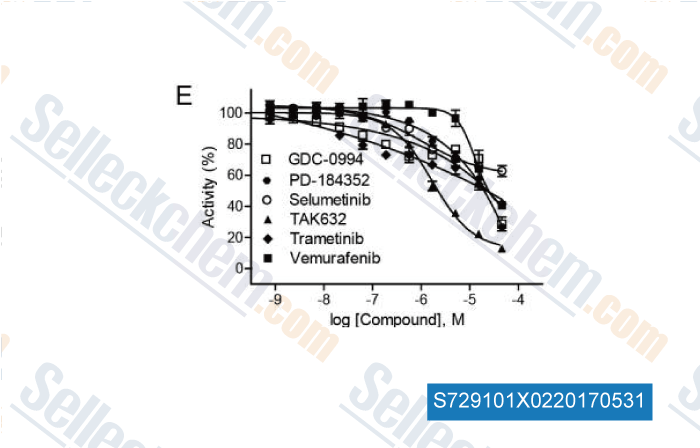 | in vitro | TAK-632 inhibits phosphorylation of MEK and ERK in melanoma A375 cells (BRAFV600E) with IC50 of 12 nM and 16 nM, respectively. In human melanoma HMVII cells (NRASQ61K/BRAFG469V), this compound also shows strong inhibition of pMEK and pERK with IC50 of 49 nM and 50 nM, respectively. Moreover, it also exhibits antiproliferative activity in both A375 and HMVII cells with GI50 of 66 nM and 200 nM, respectively. This chemical induces RAF dimerization but inhibits the kinase activity of the RAF dimer because of its slow dissociation from RAF. The combination of this compound and TAK-733 exhibits synergistic antiproliferative effects in BRAF- and NRAS-mutated melanoma cells. |