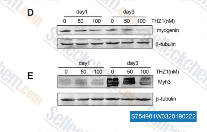 | in vitro | THZ1 uses a unique mechanism, combining ATP-site and allosteric covalent binding, as a means of attaining potency and selectivity for CDK7. THZ1 irreversibly inhibits RNAPII CTD phosphorylation by covalently targeting a unique cysteine located outside the kinase domain of CDK7. THZ1, but not THZ1-R, completely inhibits the phosphorylation of the established intracellular CDK7 substrate RNAPII CTD at Ser 5 and Ser 7, with concurrent loss of Ser 2 phosphorylation at 250 nM in Jurkat cells. THZ1 exhibits strong antiproliferative effects across a broad range of cancer cell lines from various cancer types. In Jurkat cells, low-dose THZ1 has a profound effect on a small subset of genes, including the key regulator RUNX1, thus contributing to subsequent loss of the greater gene expression program and cell death. THZ1 causes defects in Pol II(polymerase II) phosphorylation, co-transcriptional capping, promoter proximal pausing, and productive elongation. |