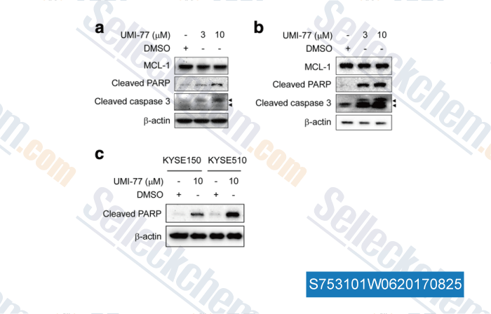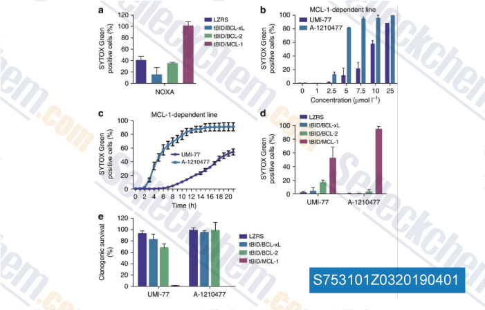 製品説明 UMI-77 is a selective Mcl-1 inhibitor with Ki of 490 nM, showing selectivity over other members of Bcl-2 family.