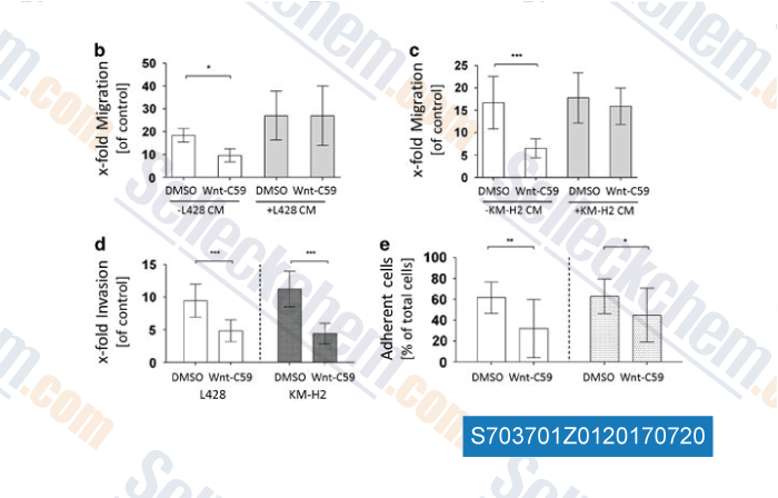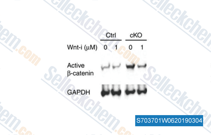 | in vitro | Wnt-C59 (C59) is claimed to inhibit PORCN enzyme activity at nanomolar concentrations. At 10 nM, it blocks the palmitoylation-dependent Wnt–WLS interaction in HeLa cells transfected with either WNT3A-V5 or WNT8A-V5 plasmids. This compound (100 nM) prevents incorporation of palmitate into WNT3A in HeLa cells transfected with WNT3A-V5, consistent with inhibition of PORCN activity. It (100 nM) inhibits the activity of all splice variants of murine PORCN in PORCN-null HT1080 cells transfected with PORCN. Wnt-C59 is a nanomolar inhibitor of mammalian PORCN acyltransferase activity and blocks activation of all evaluated human Wnts. It does not significantly inhibit the proliferation of any of 46 tested cancer cell lines in vitro at concentrations that completely inhibit PORCN. [1] Wnt-C59 is capable to significantly inhibit proliferation and comparable to the ICG-001 treated NMuMG (NMG) cells. It inhibits sphere formation by threefold in NMuMG (NMG) cells, which is dependent on Wnt10b-secretion. This compound inhibits proliferation of human MDA-MB 231 cells by >50%. [2] As a Porcupine inhibitor, it blocks radiolabel incorporation of [125I]iodo-pentadecanoate in mouse L-Wnt3a cells transfected with Flag-Porcupine. [3] |