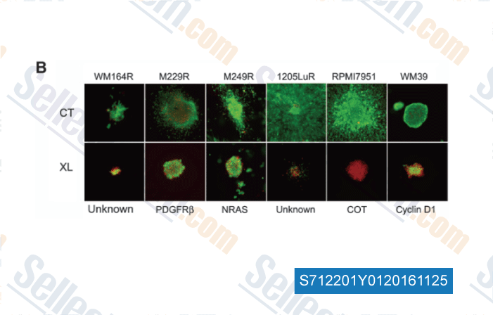 | in vitro | XL888 induces HER2 degradation in NCI-N87 cells with IC50 of 56 nM. This compound inhibits the proliferation of HER2 over-expressed NCI-N87, HER2 over-expressed BT-474, HER2 over-expressed MDA-MB-453, MET mutated MKN45, B-Raf mutated Colo-205, B-Raf mutated SK-MEL-28, EGFR mutated HN5, EGFR mutated NCI-H1975, PI3K mutated MCF7, and K-Ras mutated A549 with IC50 of 21.8, 0.1, 16.0, 45.5, 11.6, 0.3, 5.5, 0.7, 4.1 and 4.3 nM. [1] The growth inhibitory effects of this compound are associated with induction of either a G1-phase cell-cycle arrest (WM164, M229, M229R, M249, M249R, 1205Lu, and WM39 cell lines) or a G2-M phase cell-cycle arrest (WM164R, 1205LuR, and RPMI 7951 cell lines). This chemical (300 nmol) induces high levels ( > 66%) of apoptosis, and loss of mitochondrial membrane potential (TMRM) in these cell lines. The cytotoxic effects of this compound are durable with no signs of colony formation observed in any of the cell lines even cultured up to 4 weeks. Treatment with this chemical (300 nM) leads to robust time-dependent increases in the expression of HSP70 isoform 1. This compound (48 hours, 300 nM) treatment increases the expression of BIM-EL, BIM-L, and BIM-S expression in the M229R, 1205LuR, RPMI7951, and WM39 cell lines, induces expression of BIM-L and BIM-S in the WM164R cell line, and BIM-EL in the M249R cell line. [2] |