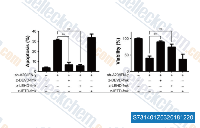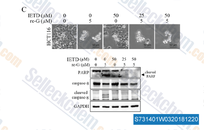| in vitro | Z-IETD-FMK, which inhibits the cleavage of caspase-8 and partially inhibits the cleavage of caspase-3 and PARP, prevents the execution of apoptosis in retinal cells exposed to different apoptotic stimuli. [1] This compound (50 μM) reduces ceramide-induced cardiomyocyte death and significantly inhibits the activation of caspase 3. [2] Inhibition of caspase-8 by this chemical affects the generation of activated/memory T cells and T cell cytokine production, and decreases NF-kappaB responses to TCR:CD3 engagement in T cell cultures. [3] |